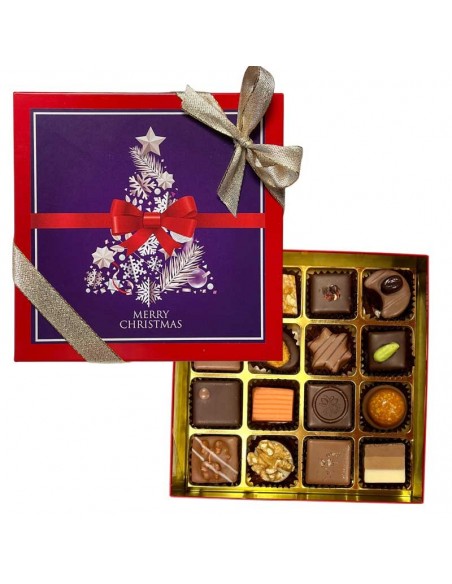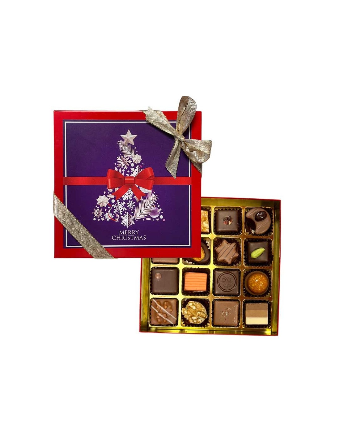 Our Christmas tin with 16 different pralines. Elegantly packaged in a filigree tin with matching mesh. 165g pralines.