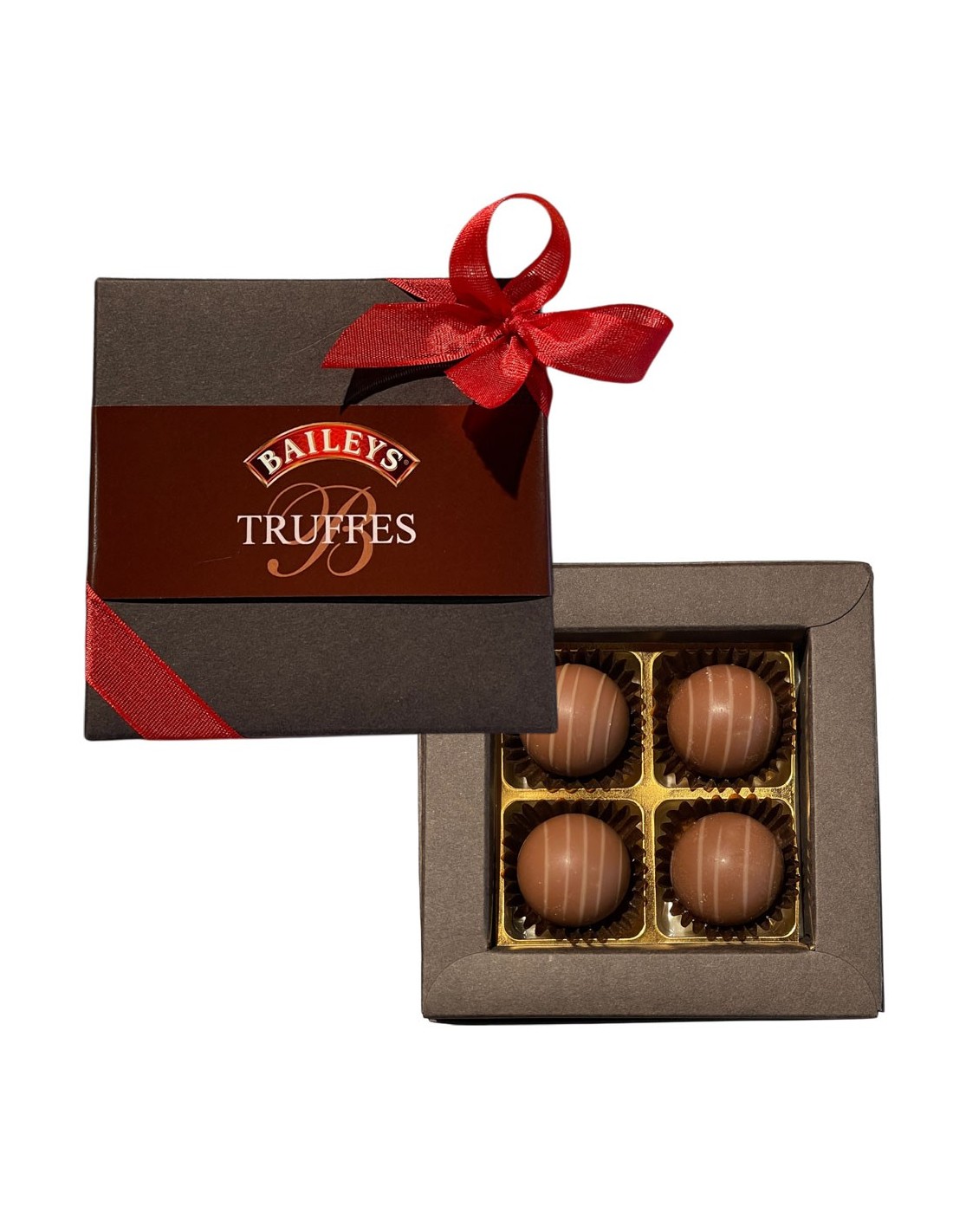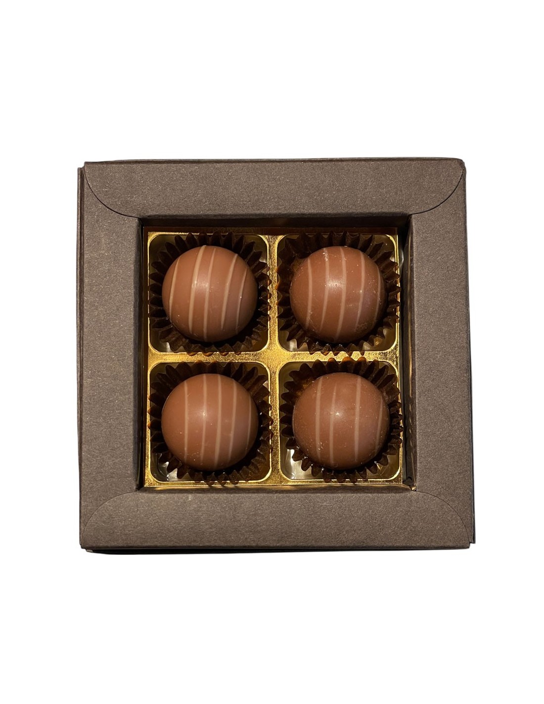 A blend of white chocolate with Baileys and covered with milk chocolate and a dust of sugar.